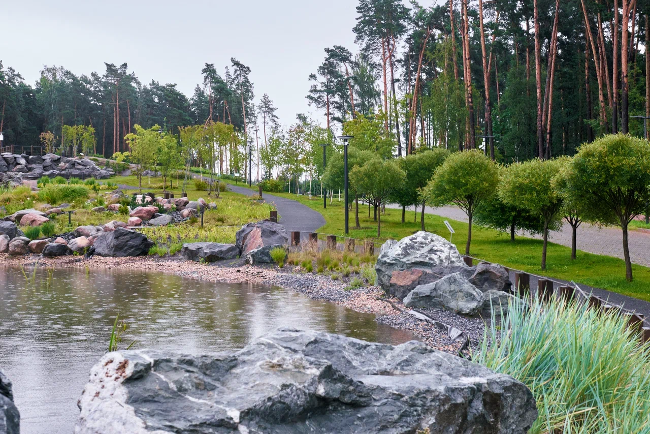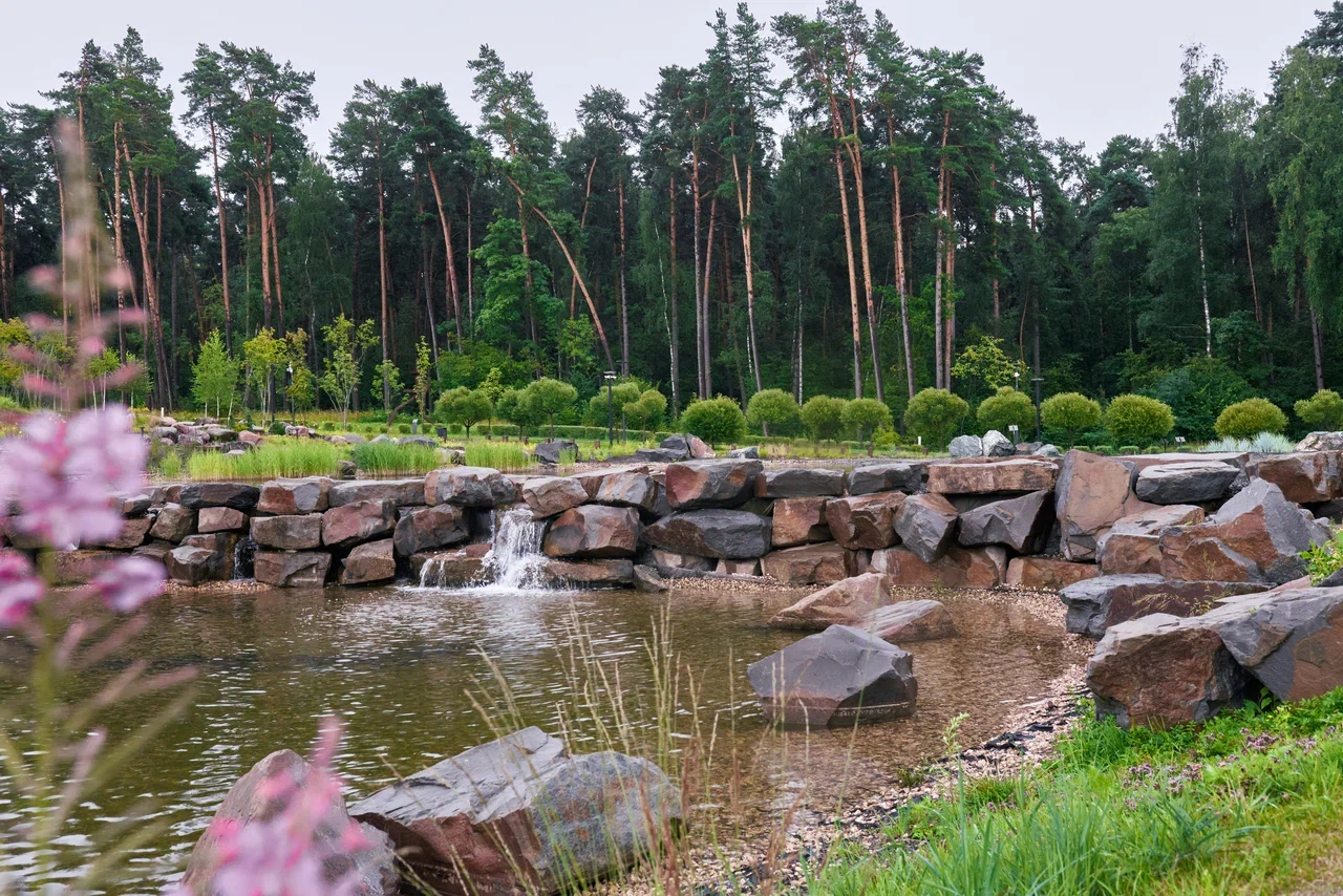 Каскад с водопадами в парке Малевича — интересный пример современного ландшафтного дизайна. Система водопадов была спроектирована архитекторами так, что искусственные элементы выглядят натурально и органично в подмосковной природе.
